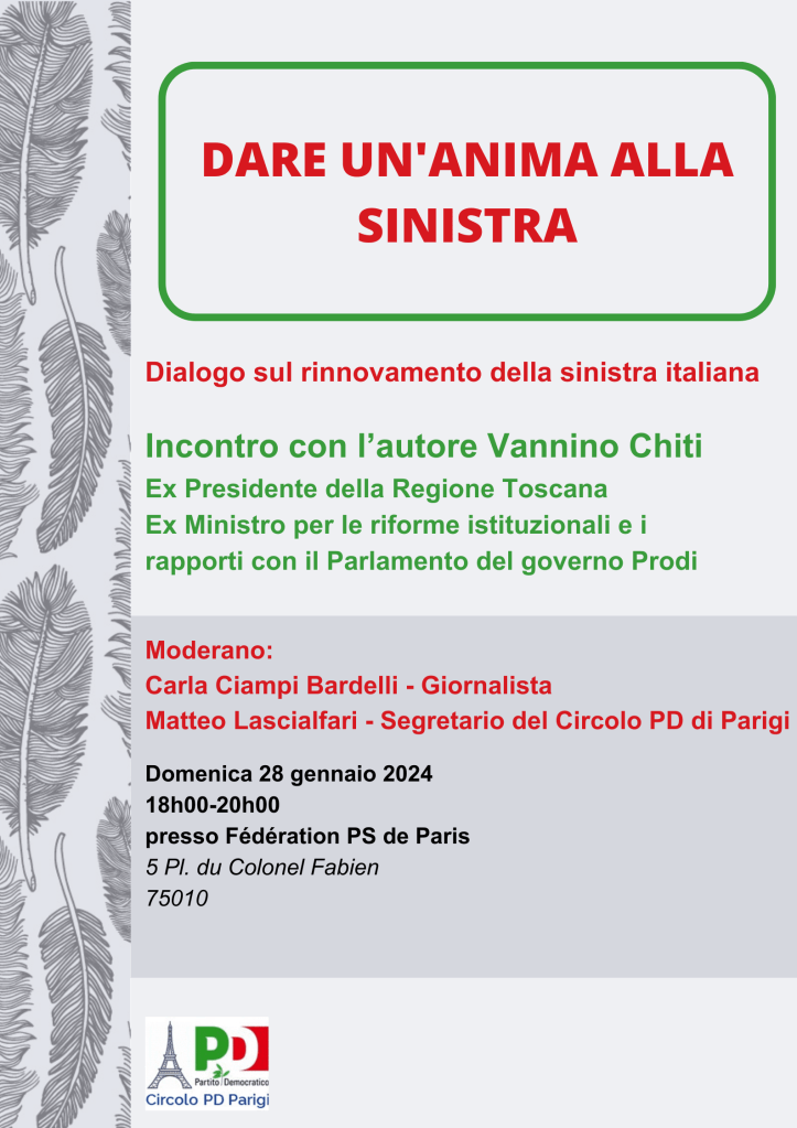 Moderano l’incontro la giornalista Carla Ciampi Bardelli e il Segretario del Circolo PD di Parigi Matteo Lascialfari.